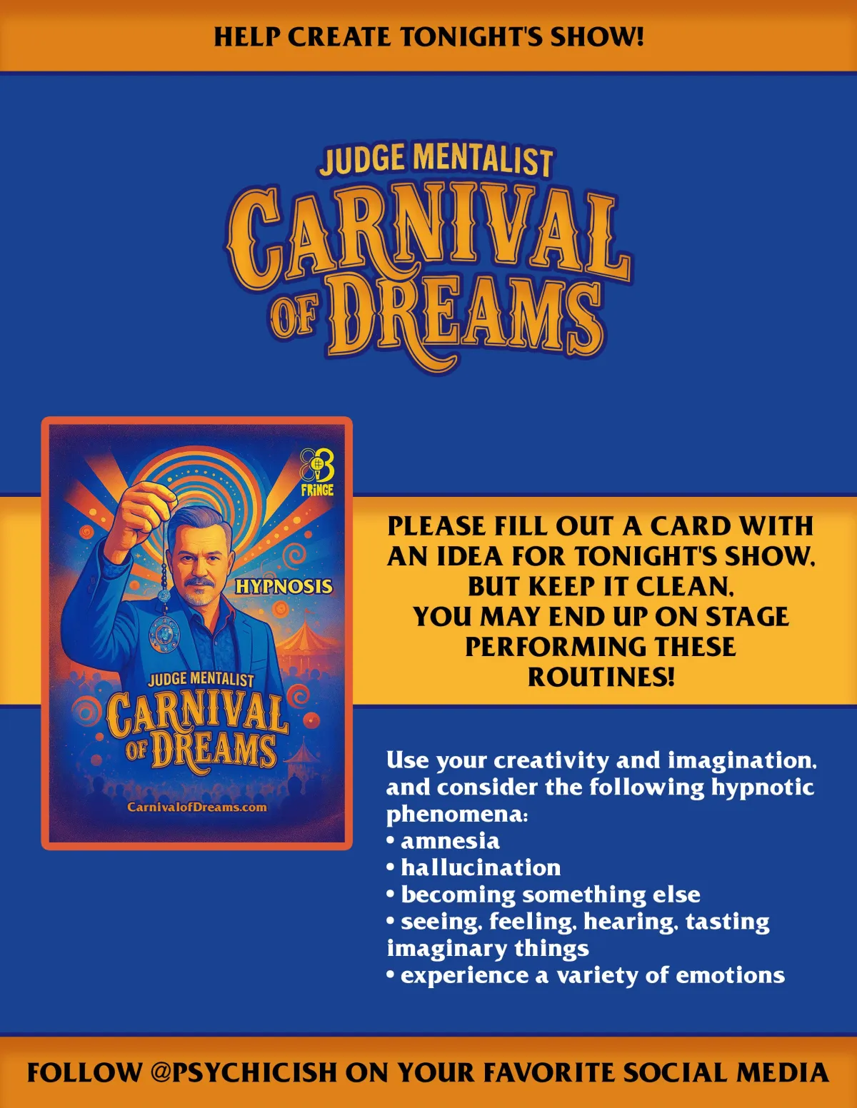 The Carnival of Dreams show concept will take ideas provided by audience members BEFORE the show starts, to create a mostly unique and specific show for THAT audience!